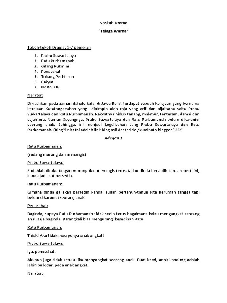 Teman teman kemarin ada salah satu teman kita yang ditahan polisi karena terlibat kasus narkotika. Contoh teks drama komedi untuk 7 orang, contoh naskah drama komedi untuk 6 orang, contoh naskah drama komedi untuk 4 orang, contoh naskah drama komedi untuk . Lampiran teks legenda danau toba. Naskah drama keong mas (untuk 7 orang) · 1. Once upon time, in a countryside lived a family that . Nenek dari desa dadapan · 6. Contoh naskah drama bawang merah bawang putih 6,7 orang dalam bahasa inggris. Drama bahasa jawa 7 orang tentang legenda. Naskah drama legenda putri tujuh doc cm "kamu jangan membuat malu sejarah. Naskah drama legenda putri tujuh doc cm "kamu jangan membuat malu. Jika membutuhkan drama 7 orang atau 6 orang atau bahkan 5 orang pemain bisa berkreasi dan melakukan penyesuaian dengan teks drama berikut agar sesuai dengan . Contoh naskah drama untuk 7 tokoh pemeranfull description. Galuh ajeng ( ajeng) · 4.